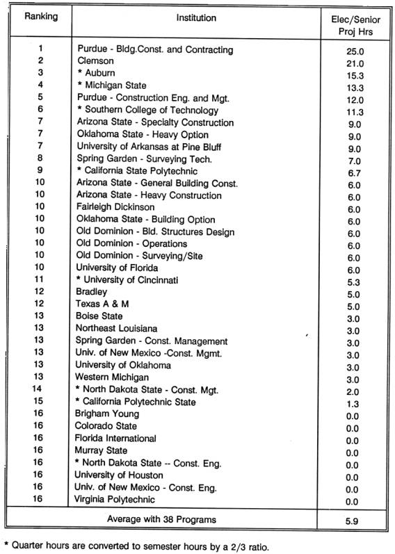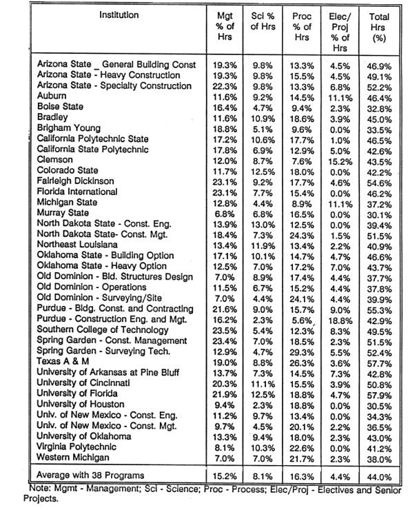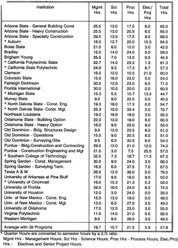 A few courses not taught within a construction department were included in the analysis since they relate directly to construction. A few examples of these courses are personal computers, structures and surveying. Due to the capacity of some programs, these types of courses are taught by other departments. Basic structure courses such as statistics are excluded while courses teaching the design of construction elements (steel, timber, and concrete) are included. By limiting the type of structure courses included in the analysis, the focus of the study is centered upon courses relating directly to construction.