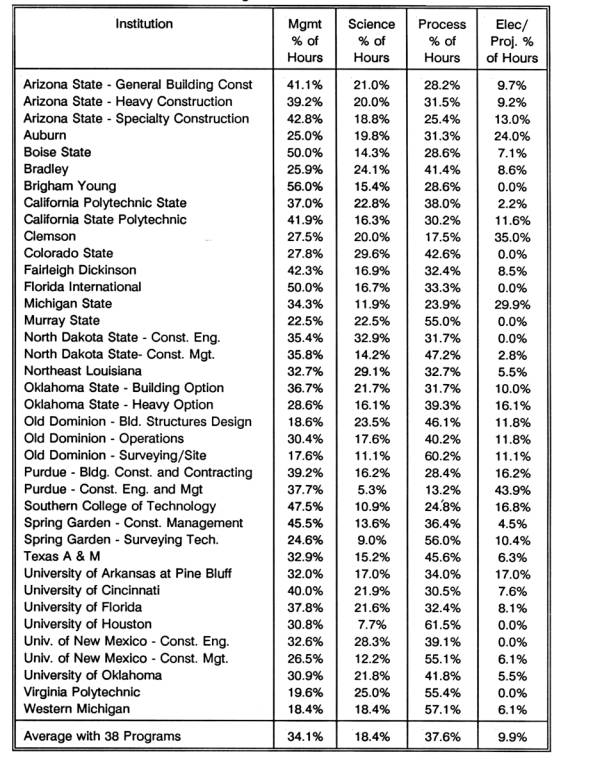 The breakdown of semester hours (SH) in construction courses, Table 1, provides an overall view of the construction programs incorporated in this study. This table supplies the number of SH for the four key categories of management, science, process, and electives for each program. The analysis is performed in semester credit SH. Programs utilizing a quarter system are converted to semester credit SH by multiplying the quarter credit SH by a 2/3 factor. The bottom of the table provides the average SH for each category.
