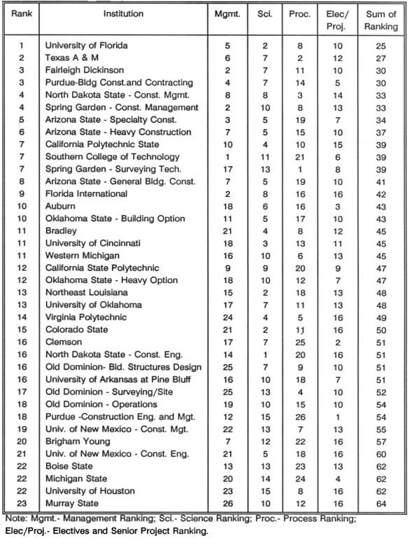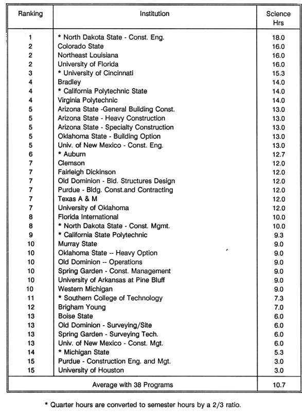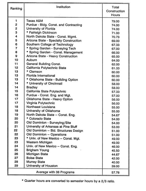 Since the purpose of the study was to evaluate programs by construction‑related courses, courses taught outside a program's department (such as accounting, business law, and engineering economy) were not included. Due to this restriction, programs teaching these types of courses within their departments gain a distinct advantage in the results of the analysis over programs having these courses taught by other departments within the university. Courses such as these were included since use in construction is the main focus.