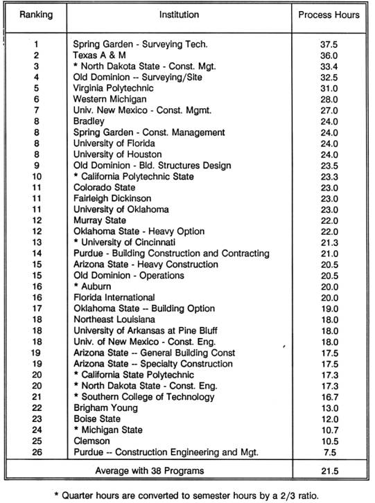 The results of this study shown in Table 4 demonstrate that undergraduate building construction programs, on the average, devote the majority of their curriculum to the construction process category. This category contains the highest average of SH,21.5,ofthefourkeycategories. The 21.5 process SH equals 37.6 percent of all construction SH. Ranking of process category, Table 4, lists the programs in decreasing order of process SH.